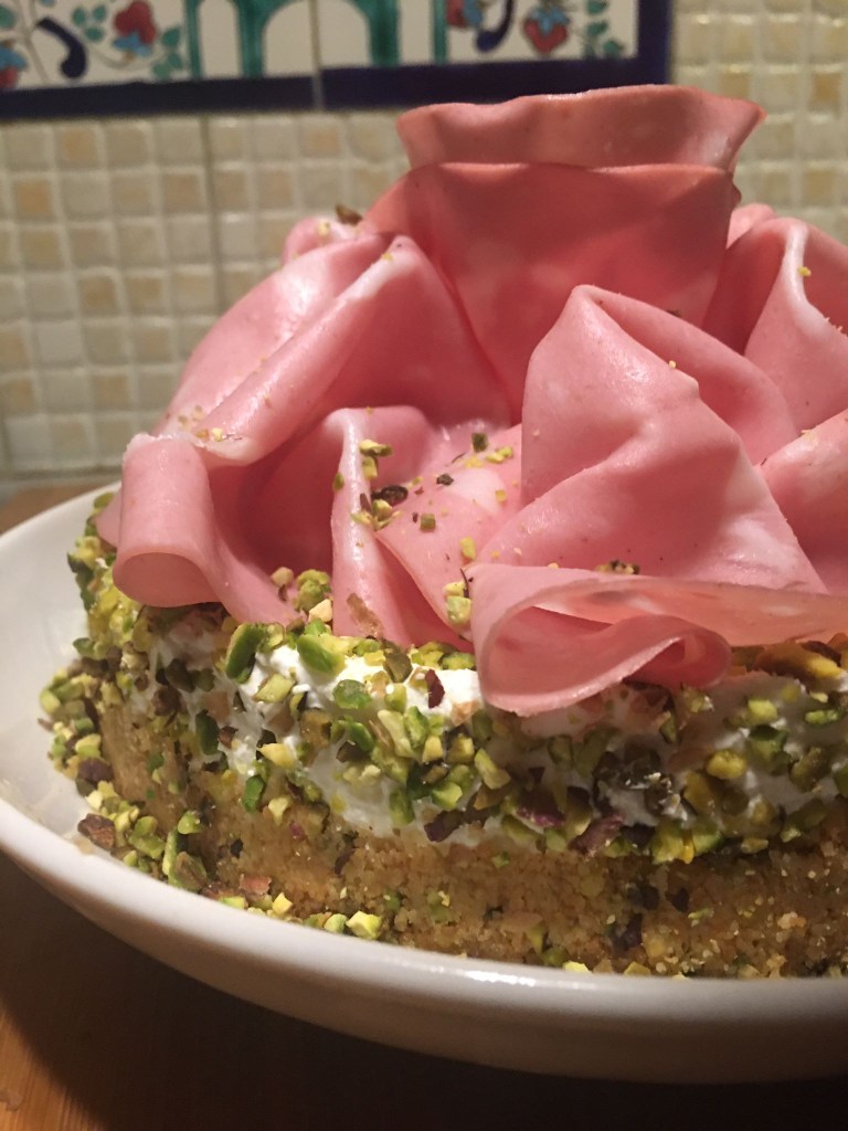 Dispongo le fette di mortadella arricciate su se stesse o come preferite, un pizzico di pistacchio a finire.