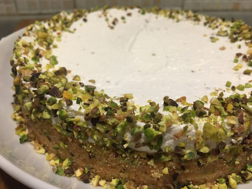 Unisco la ricotta al formaggio fresco, aggiungo sale pepe e la metà dei pistacchi avendo cura di tritarli grossolanamente.Amalgamo bene e con l’aiuto di una saccapoche (cucchiaio, paletta o come vi pare) vado a stendere il secondo strato nella teglia che nel frattempo avrò tolto dal freezer.Tolgo la cerniera delicatamente e con l’aiuto del palmo della faccio aderire tutt’attorno i restanti pistacchi che avrò tritato.